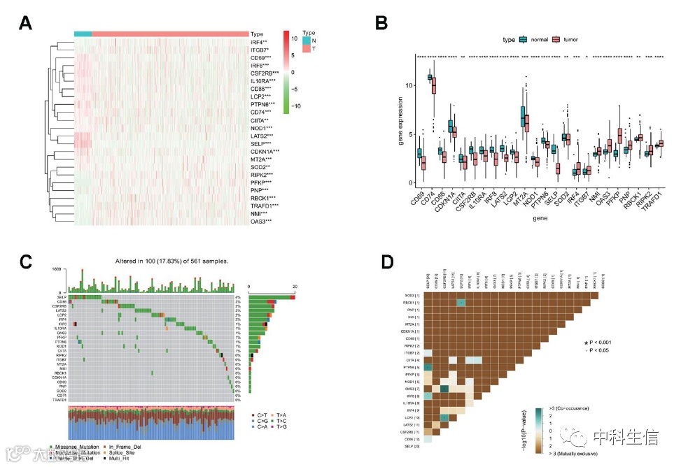 我们使用 TCGA LUAD 数据库,总结了 TCGA LUAD 患者的临床病理信息,根据最初的单变量 cox 分析,在随后的研究中使用了 24 种干扰素 γ 反应基因。为了鉴定这些基因,我们比较了24个干扰素γ反应基因在肿瘤和正常样本中的表达谱,并以热图和盒图显示,15个干扰素γ反应基因在肿瘤样本中的表达明显下调,包括CD69、CD74、CD86、CDKN1A、CIITA、CSF2RB、IL10RA、IRF8、LATS2、LCP2、MT2A、NOD1、PTPN6。在TCGA LUAD样本中,发现SELP的突变频率最高,其次是CD86、CSF2RB、LATS2、LCP2、IRF4和IRF8等,而CD74和TRAFD1在这些样本中未发现任何突变。进一步分析发现,SELP与PTPN6、SELP与IRF8、OAS3与CSF2RB1、LCP2与CSF2RB1以及LCP2与RBCK1之间以及LCP2与RBCK1之间存在显著的突变共生关系。