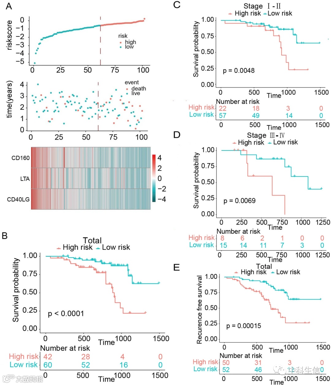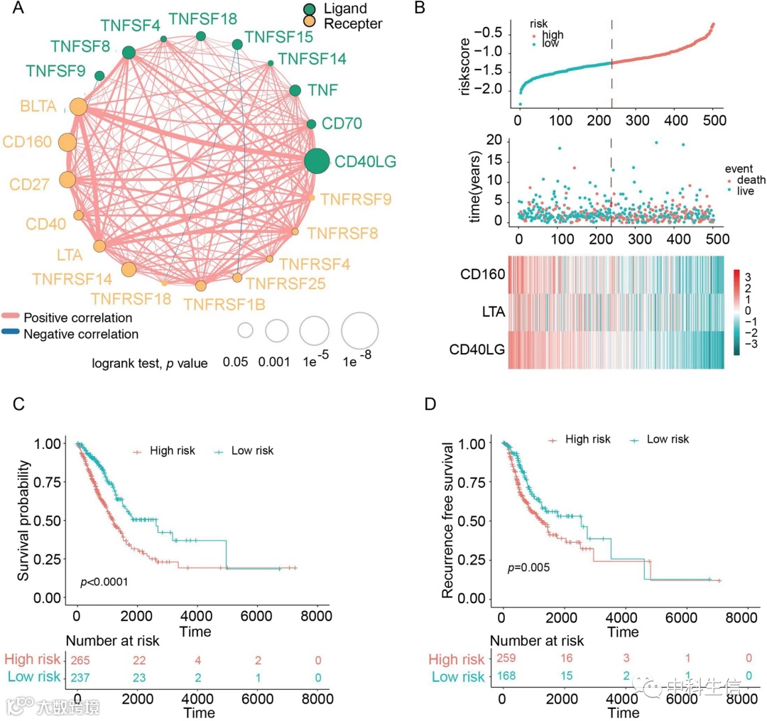 接下来对这7个预后相关的免疫检查点进行进一步分析。接下来,作者使用逐步Cox回归筛选预后显著相关的基因。最终得到了3个基因:CD160、LTA和CD40LG。根据这3个基因的表达情况,作者计算了风险评分。患者的风险评分分布如图1B所示,依据中位数将患者分为高风险组和低风险组。高风险组OS和RFS都显著高于低风险组(图1C, D)。根据多变量Cox分析,即使在纠正了其他临床变量的混杂因素之后,这种新的风险评分仍可作为LUAD的独立预后因素(表2)。