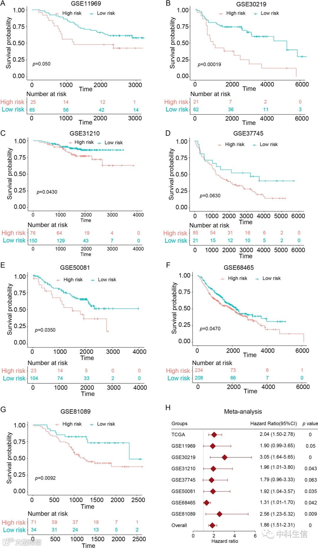 为了验证7个免疫检查点分子构建模型的可靠性,作者在7个GEO数据集进行了验证。这些数据集的人口统计数据见表1。根据训练集确定的最佳风险评分临界值,这七个数据集中的所有患者都被分为高风险组和低风险组。作者发现在GSE11969 (图2A)、GSE30219 (图2B)、GSE31210 (图2C)、GSE50081 (图2E)、GSE68465 (图2F)、GSE81089 (图2G)这6个数据集中高风险组患者的OS低于低风险组,在GSE37745数据集中无显著差异(图2D)。此外,为了验证新的基于免疫检查点的预后模型的价值,作者还对这7个GEO数据集和TCGA数据进行了预后meta分析。分析结果进一步证明,这种预后特征是LAUD的风险预测因子(图2H)。