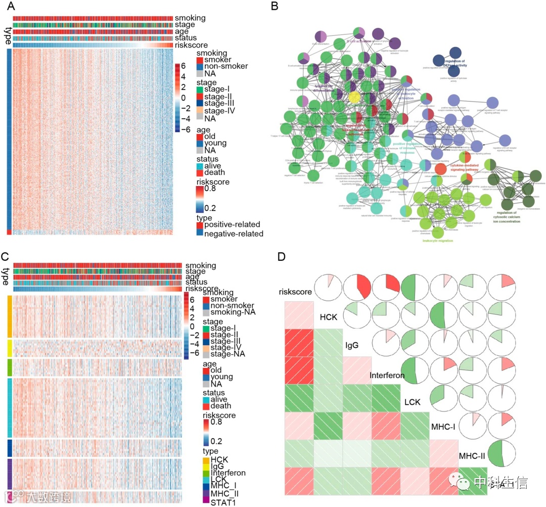 接下来作者计算了风险评分和基因间的pearson相关系数。结果显示,约436个基因与风险评分呈负相关,12个基因与风险评分呈正相关(图4A)。接下来,对这些基因进行了GO和KEGG分析,结果显示它们主要富集于免疫应答和白细胞活化通路(图4B)。同时,作者希望进一步探讨风险评分相关的炎症反应,所以分析了HCK、干扰素、LCK、MHC-I、MHC-II、STAT1、IgG与风险评分之间的关系。结果发现这7个基因广泛代表了与炎症反应和免疫调节相关的通路。图4C显示了这些meta基因的分布。采用GSVA对7个基因进行验证。结果表明,风险评分与IgG、干扰素和STAT呈正相关,与LCK和MHC-II呈负相关(图4D)。