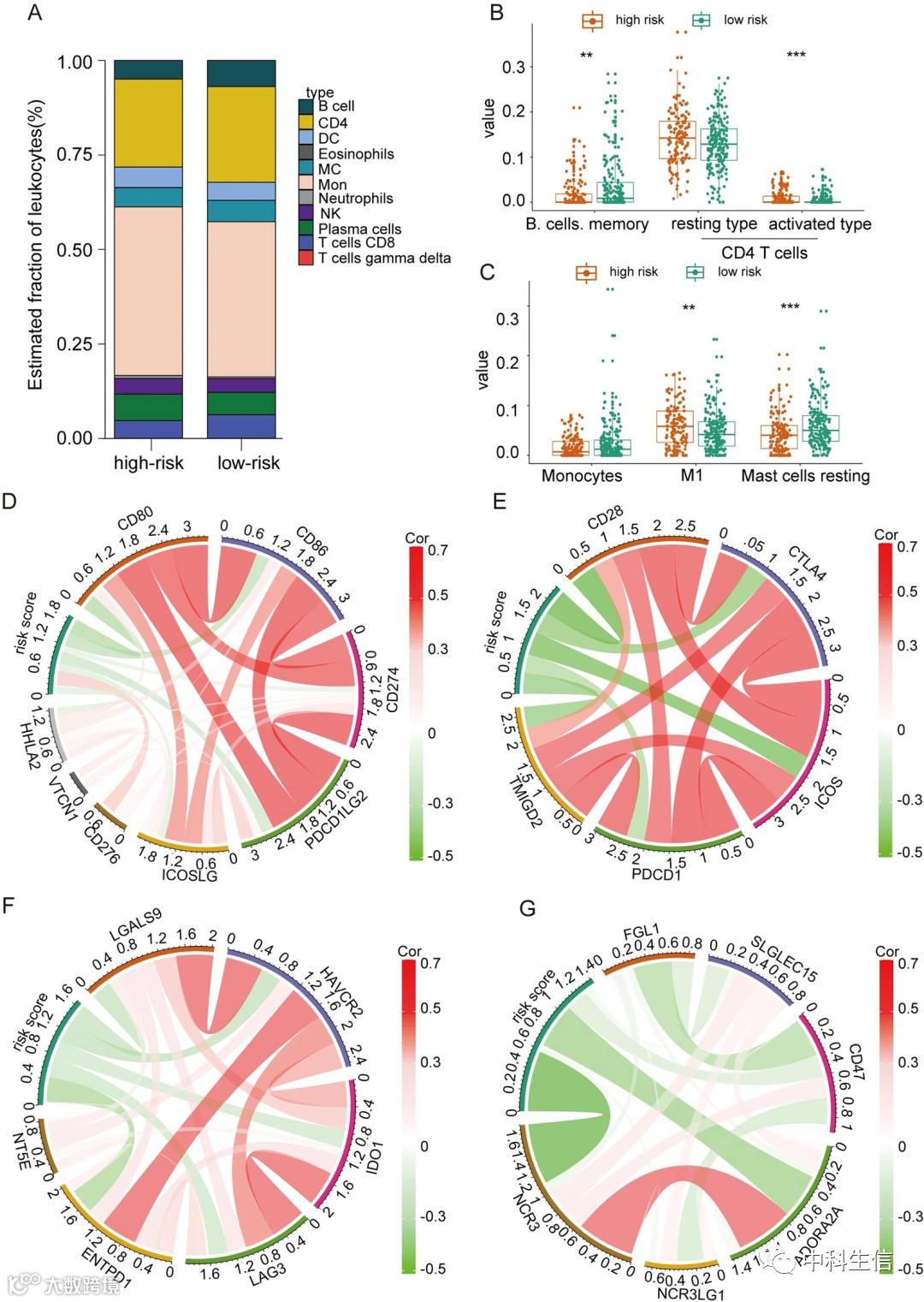 接下来作者结合了CIBERSORT和LM22来评估训练集中的免疫细胞浸润。结果发现,高风险和低风险组的患者有不同的免疫细胞浸润评分(图5A)。高风险组的静息CD4 T细胞、巨噬细胞M1浸润率较高,而记忆B细胞和静息T细胞浸润率较低(图5B, C)。同时,由于一些免疫检查点可以构建一个通讯系统来调节抗肿瘤免疫应答,接下来作者试图探索患者风险评分与这几个重要的免疫检查点之间的相关性。Pearson相关分析显示风险评分与CD276呈正相关。CD276是B7-28家族的重要免疫检查点,靶向CD276的免疫疗法在各种肿瘤中都取得了积极的结果(图5D-G)。这个结果表明,高风险组患者可能受益于靶向CD276的免疫治疗。