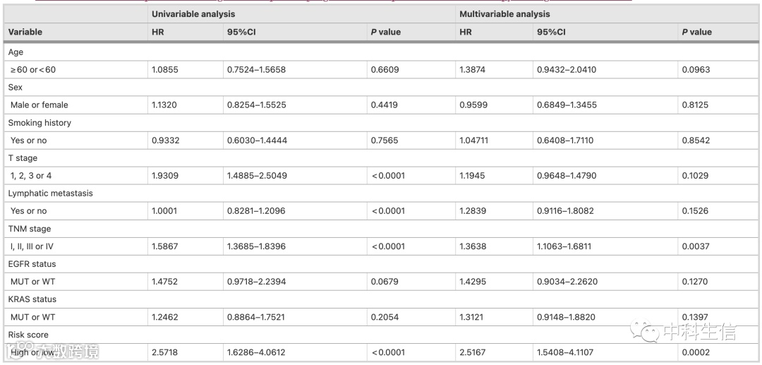 此外作者还利用qRT-PCR在一个由102例LUAD患者的冷冻样本组成的独立队列中验证该风险评分。该队列的人口统计数据见表3。作者利用风险评分公式将患者分为高低风险组(图3A)。结果发现两组间OS和RFS都具有显著差异(图3B, E)。由于不同临床分期的LUAD患者具有不同的治疗方式和预后,所以作者在早期(临床I期、II期)和晚期(临床III期、IV期)亚组中也采用了该风险评分。结果观察到,在这些临床分期亚组中,高风险组患者相较于低风险组患者具有更短的生存期(图3C, D)。最后,作者通过qPCR数据和多变量Cox回归分析证实,该风险评分与102例LAUD患者的OS独立相关(表3)。
