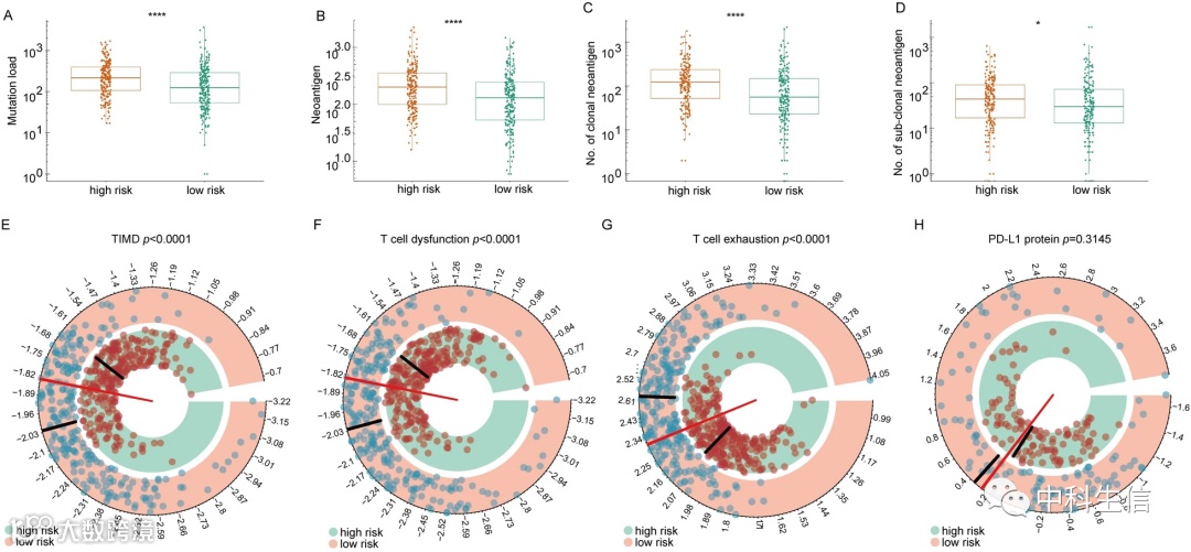 如今,针对免疫检查点的免疫疗法对癌症治疗的意义日益重要,成为各种肿瘤的首选疗法,尤其是对LAUD而言。同时,这些新的免疫检查点分子也是潜在的候选免疫治疗检查点。作者试图找出这种特征基因和免疫治疗反应之间的关系,因此选择了一些经典的被广泛认可的生物标志物,并分析了它们与风险评分的关系。首先,作者计算并评估了高、低风险患者的肿瘤突变负荷(TMB)、新抗原数量以及克隆和亚克隆新抗原数量。高风险组表现出较高的TMB,以及这三种新抗原(图6A-D)。其次,作者还比较了高风险组和低风险组患者的PD-L1蛋白表达水平,发现了高风险组和低风险组患者PD-L1蛋白平均表达水平的交界性差异(图6H)。最后,作者也将准确可靠的免疫治疗TIDE评分应用于当前的研究。作者系统地探讨了不同组患者的TIDE评分、T细胞功能障碍和排除评分。正如预期的那样,高风险患者的TIDE评分较低,T细胞功能障碍和排除评分较高(图6E-G)。然而,TIS评分与风险评分呈负相关,低风险患者的TIS评分也高于高风险患者,这与上述结果相矛盾。总之,这些结果表明,高风险患者可能更有可能从免疫疗法中获益。