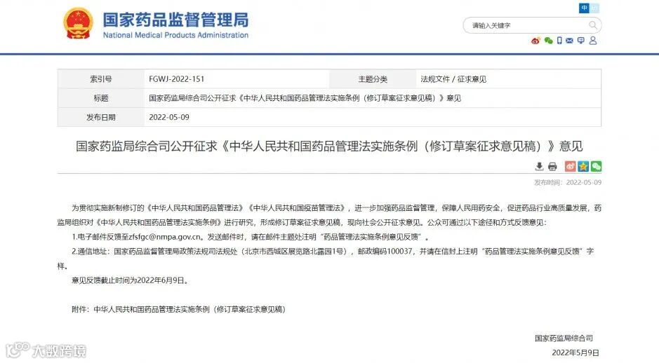5月9日,国家药监局发布《中华人民共和国药品管理法实施条例(修订草案征求意见稿)》(以下简称征求意见稿),向社会公开征求意见。征求意见稿共十章181条,与现行《中华人民共和国药品管理法实施条例》(以下简称《条例》)相比全文条目增加了101条,不仅新增了药品上市许可持有人、药物警戒等条款,其余章节也在现行《条例》相关内容的基础上进行了修改、丰富。
