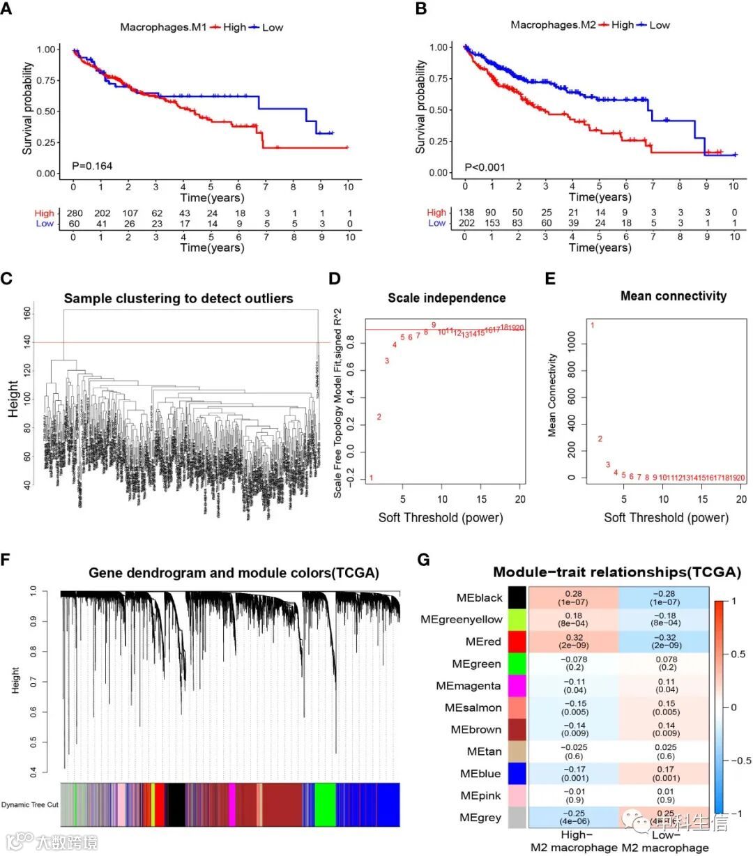 CIBERSORTx 算法用于计算 TCGA-LIHC 样本中 M1 和 M2 巨噬细胞的含量区分高低表达进行生存分析。随后使用WGCNA分析M2 巨噬细胞相关的模块。