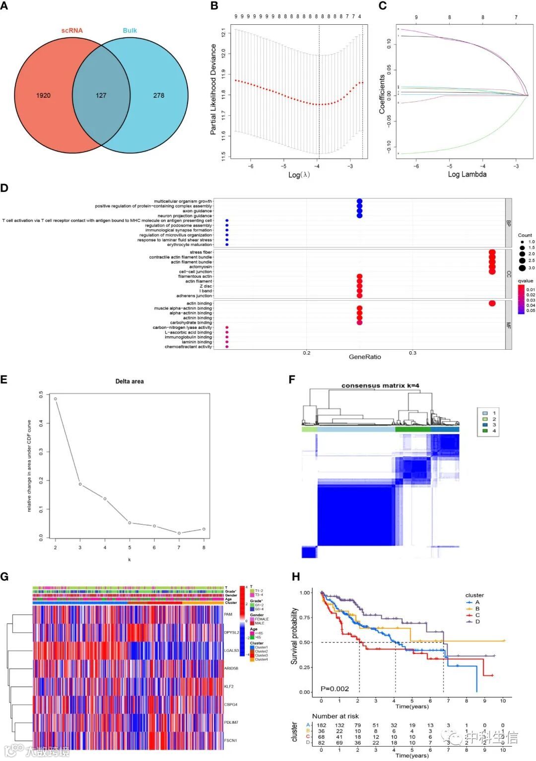 对交集基因进行单因素cox分析,随后使用lasso分析构建预后模型。对构建模型基因进行富集分析。同时进行共识聚类分成4个亚群具有显著差异。