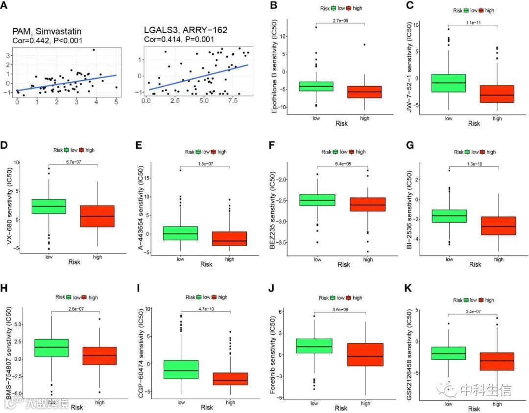 使用 CellMiner 数据库来探索预后基因与药物敏感性之间的关系。随后使用pRRophitic进一步分析。