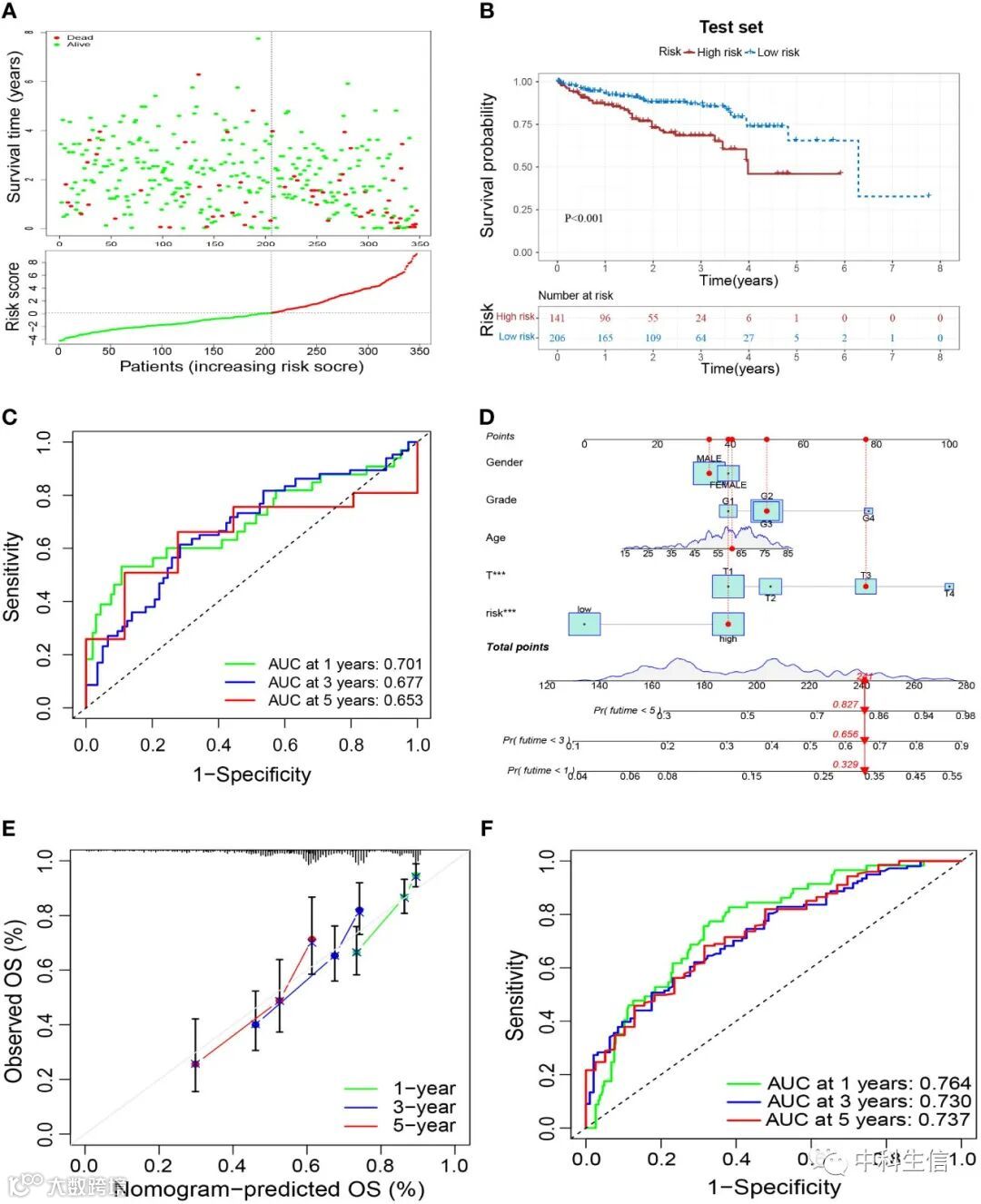 为了评估风险模型的性能,绘制了 ROC 曲线。同时进行单变量和多变量分析(图 5D、E)和一致性指数(C-指数)分析。