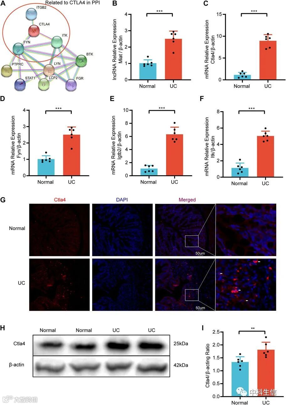 作者利用DSS在小鼠中构建了UC模型,通过qRT-PCR检测了CTLA4和三个强相关mRNA (FYN、ITK和IGTB2)的mRNA表达水平(图9A)以及心肌梗死相关转录本(MIAT)的lncRNA表达水平,以验证数据集的可靠性。与正常组相比,UC组CTLA4、FYN、ITK、ITGB2、MIAT的表达水平显著升高(图9B F), IF和WB证实关键hub基因CTLA4在蛋白水平上较正常组显著升高(图9G I)。