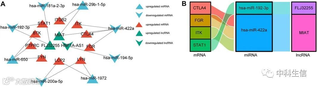作者利用上述lncRNA-miRNA、miRNA-mRNA和lncRNA-mRNA之间的相互作用,通过Cytoscape构建了lncRNA-miRNA-mRNA调控网络,如图7A所示。最终确定了包含4个mRNA、2个miRNA和2个lncRNA的核心ceRNA子网络(图7B)。