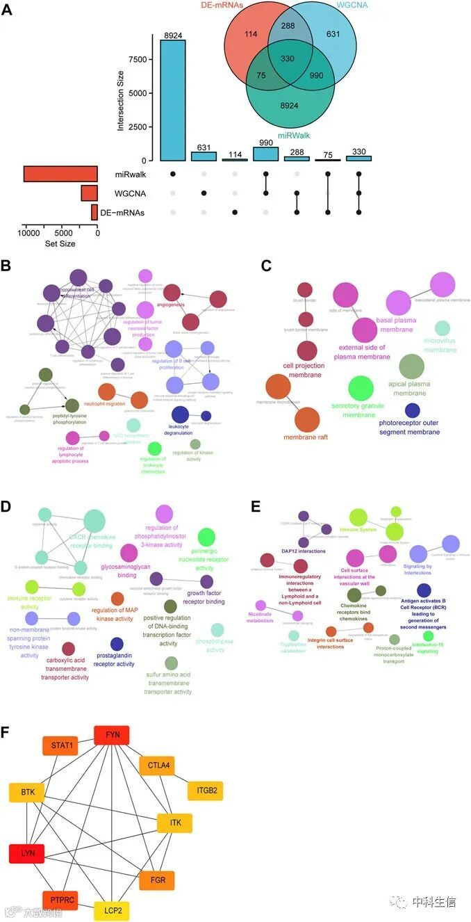 接下来作者利用miRwalk数据库预测了差异miRNA靶向的mRNA,之后差异mRNAs、WGCNA模块基因和预测靶向mRNA三者取交集得到330个mRNAs(图5A)。为了进一步了解这些基因的生物学功能,作者利用Cytoscape的ClueGO插件进行了GO功能富集和Reactome通路富集,结果如图5B-E所示。随后,作者使用CytoHubba来识别PPI网络中联通度最高的hub基因。图5F显示了top10的hub基因,如LYN、FYN、PTPRC、STAT1、FGR、CTLA4、BTK、ITK、ITGB2和LCP2。