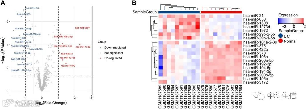 利用R包limma在数据集GSE48957中识别差异miRNAs。通过火山图和热图,作者发现UC组与正常组相比,有7个DE-miRNAs明显增加,12个DE-miRNAs减少(图2和表2)。