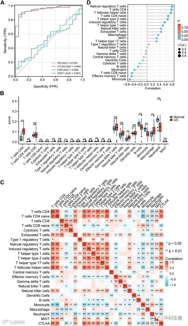 为了进一步验证假设,作者使用immuCellAI数据库计算了正常组和UC组之间的免疫细胞丰度。如图8B所示,UC组中CD4+ T细胞、CD4 naïve T细胞、耗尽T细胞、自然调节性T细胞、诱导调节性T细胞、T辅助1型细胞、T辅助2型细胞、T辅助17型细胞、T滤泡辅助细胞、自然杀伤细胞、巨噬细胞的比例均高于正常组,CD8 naïve T细胞、细胞毒性T细胞、效应记忆T细胞、单核细胞和中性粒细胞的比例均低于正常组。CTLA4表达水平与天然调节性T滤泡辅助细胞、CD4+ T细胞、天然调节性T细胞、CD4 naïve T细胞、T辅助性2细胞、诱导调节性T细胞、单核细胞具有良好的相关性(图8C, D)。