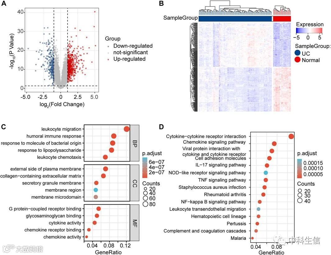 利用R包limma在数据集GSE87466中识别差异mRNAs。通过火山图和热图,作者发现UC组与正常组相比,537个差异mRNA表达明显增加,270个差异mRNA表达明显减少(图3A, B)。随后,作者进行了GO和KEGG富集分析。其中BP、MF、CC富集的top5如图3C所示。BP主要富集到白细胞迁移、体液免疫反应、对细菌来源分子的反应、白细胞趋化性和对脂多糖的反应。CC主要富集到质膜外侧、含胶原的细胞外基质、分泌颗粒膜、膜微域和膜区。MF主要富集到趋化因子受体结合、趋化因子活性、糖胺聚糖结合、G蛋白偶联受体结合和细胞因子活性。KEGG结果主要富集到病毒蛋白与细胞因子和细胞因子受体相互作用、IL-17信号通路、细胞因子与细胞因子受体相互作用等37个KEGG通路,如图3D所示。