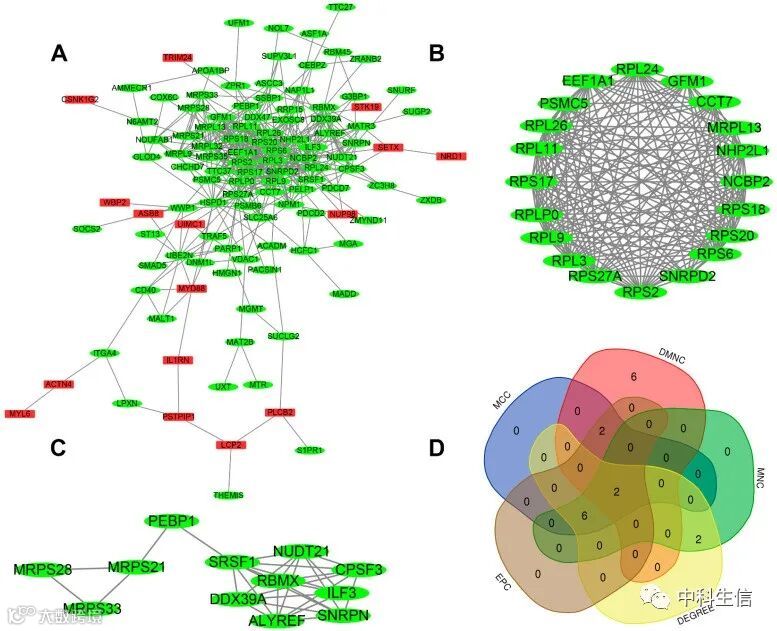 对棕色模块中的基因构建蛋白质-蛋白质相互作用网络(图6A)。使用Cytoscape中的MCODE插件,确定了两个模块(图6B-C)。cytohubba插件中MCC、DMNC、MNC、Degree和EPC五种算法获得的前十个hub重叠得到RPL9和RPL26(图6D)。