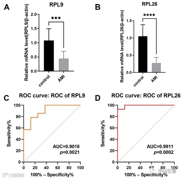 定量RT-PCR结果表明,与对照组相比,AMI组RPL9和RPL26的表达水平均降低(图8A-B),与生物信息学分析一致。ROC曲线表明RPL9和RPL26具有良好的辨别能力(图8C-D)。