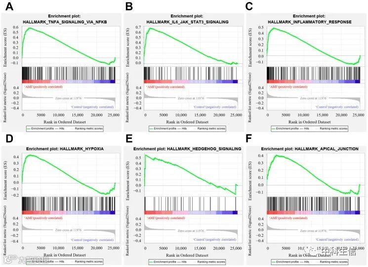 “TNFA_SIGNALING_VIA_NFKB”在AMI组中显着富集,富集分数为 0.57(图5A),表明“TNFA_SIGNALING_VIA_NFKB”可能在AMI的病理生理学中起关键作用。前六个基因组如图 5A-F所示。