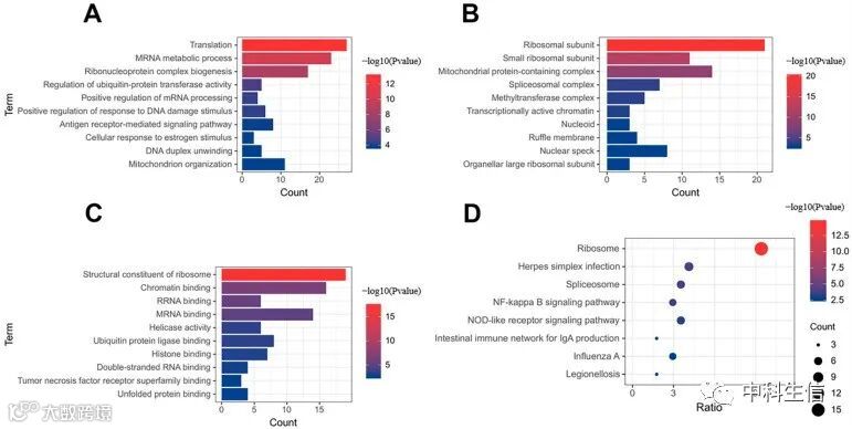 使用“GeneMania”工具,构建了一个由22个基因组成的蛋白质-蛋白质相互作用网络,其中包括RPL9和RPL26(图7A)所示。22个基因主要富集在5个生物过程、5个细胞成分和3个分子功能(7B-D)。