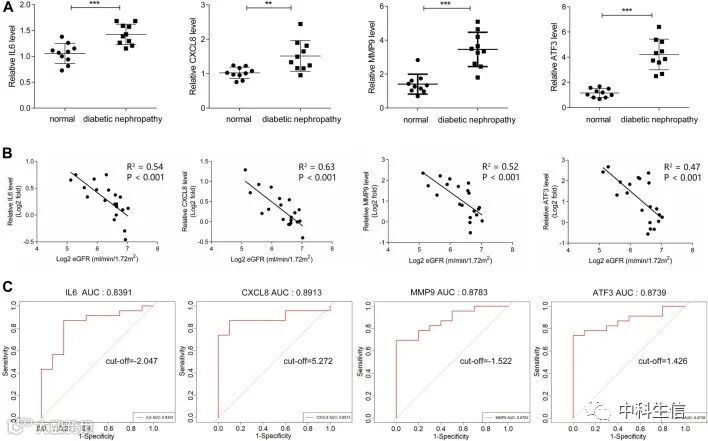通过qPCR研究了上述四个hub基因的相对表达。如图8A所示,与对照组相比,DN患者的PBMC中IL6、CXCL8、MMP9和ATF3的相对表达显着增加。hub基因的相对表达与DN患者的eGFR呈负相关(图8B)。此外,绘制ROC曲线并计算曲线下面积(AUC)以区分DN和对照,在数据集GSE142153中,四个中心基因的每个AUC均大于0.8(图8C)。