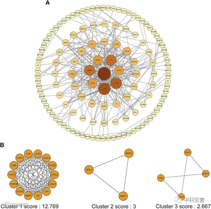 将234个Co-DEG上传到STRING进行进一步分析,得到130个节点和330个边(图6A)。共有三个基因簇,它们的得分分别为12.769、3.000和2.667(图6B)。