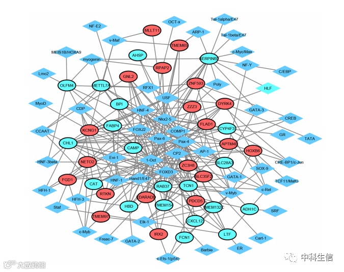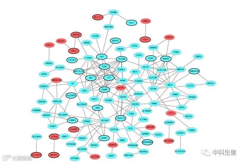 差异表达基因的蛋白质-蛋白质相互作用网络(图3)。