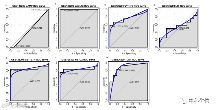 GSE126209数据集中选择的差异表达基因的 ROC 曲线(图8)。