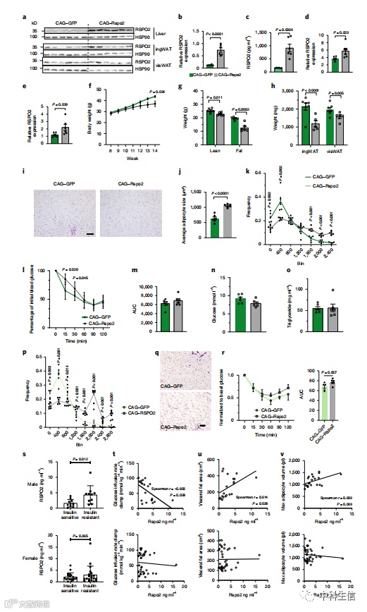 由于Rspo2在体内抑制脂肪细胞的形成,我们接下来研究了Rspo2是否会影响肥胖时脂肪组织的扩张。因此,将paav-cagr-RSPO2注射到8周龄饮食诱导的肥胖小鼠体内,可导致肝脏(图6a、b)和血浆(图6c)中RSPO2蛋白水平增加5倍,ingWAT(图6d)和visWAT(图6e)蛋白水平增加2倍。我们观察到paav-cagl-rspo2感染小鼠的体重增加减少(图6f),与食物摄入或能量消耗无关的ingWAT和visWAT小鼠的脂肪量减少(图6g)。此外,过表达RSPO2不仅减少了脂肪细胞的形成(Fig.4j),还导致了脂肪细胞的肥大(Fig.6i-k)。值得注意的是,尽管RSPO2过表达降低了体重增加,但在胰岛素耐受试验(ITT)中,较高水平的RSPO2表现出更差的胰岛素敏感性(图6l,m),而不影响空腹血糖(图6n)或肝脏葡萄糖分泌。两组间空腹甘油三酯(TG)水平未发生变化(图6o),而rspo2过表达小鼠肝脏中TG积累较少,与肝脏TG分泌的变化无关。这些数据表明,RSPO2水平升高导致的脂肪细胞肥大可能是导致代谢表型恶化的一个因素。