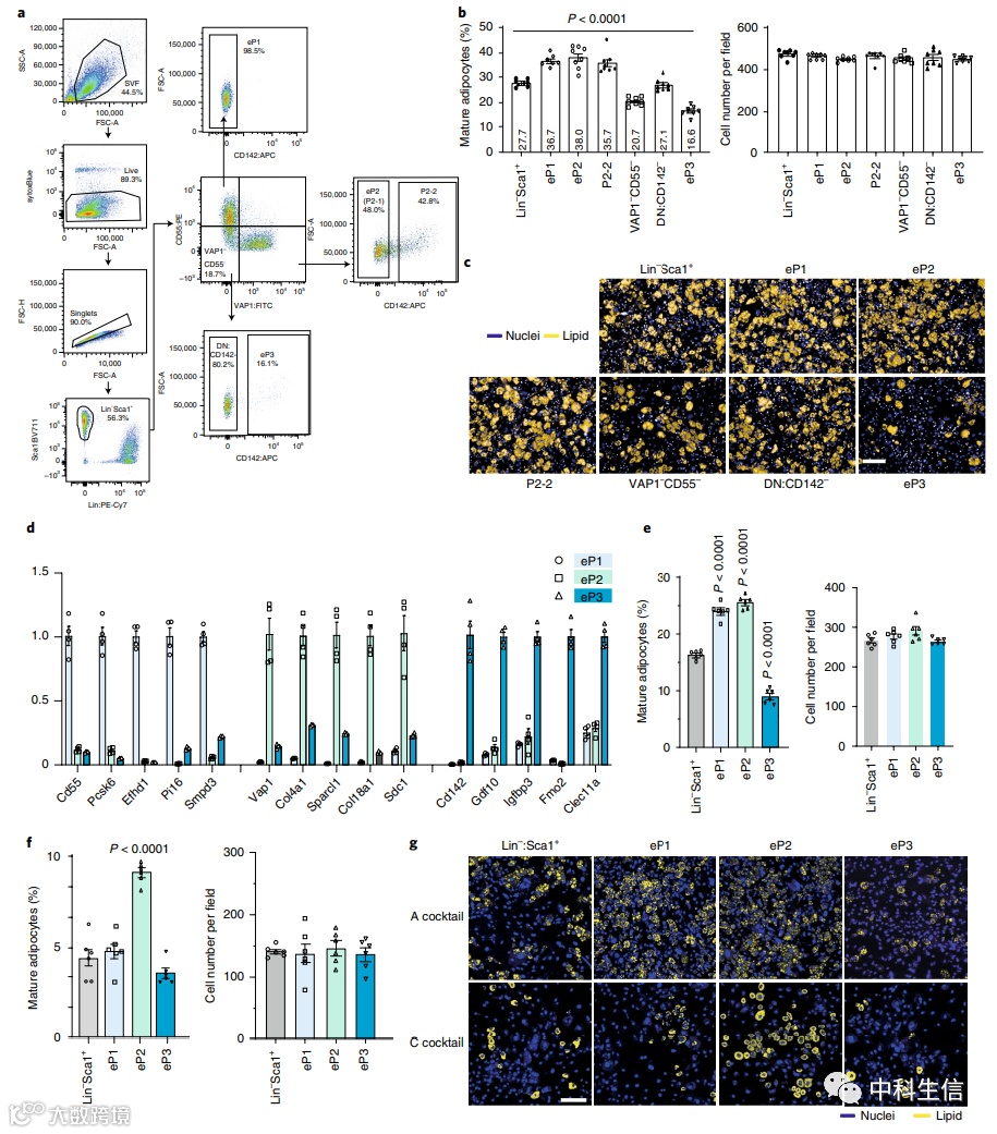 为了更可靠地分离P3细胞,并进一步研究我们联合分析中定义的细胞群的功能(图1a),我们建立了一种新的FACS策略来纯化不同的亚群。如图2a所示,使用Lin−Sca1+CD55+VAP1−CD142−选通策略分离由P1-1 ~ P1-3细胞组成的富集-p1 (eP1)。将VAP1+细胞进一步分离为P2-1和富集-p2 (eP2)细胞(Lin−Sca1+CD55−VAP1+CD142−)或P2-2细胞(Lin−Sca1+CD55−VAP1+CD142+),用Lin−Sca1+CD55−VAP1−CD142+策略分离富p3 (eP3)细胞。在成脂诱导下,eP1、eP2和VAP1+CD142+ (P2-2)细胞显示出成脂能力,我们进一步观察到,从Lin−Sca1+VAP1−CD55−(或VAP1−CD55−)细胞中去除eP3细胞,Lin−Sca1+VAP1−CD55−CD142−(或DN:CD142−)细胞中,脂肪细胞形成显著增加。这让人联想到eP3细胞无法形成脂肪的事实(图2b,c)。此外,基因表达分析表明,p3特异性基因在eP3群体中富集(图2d)。综上所述,我们能够分离出eP1、eP2、P2-2和eP3细胞,它们代表了通过10X scRNA-seq方法鉴定的P1、P2-1、P2-2和P3细胞(图1a)。EP1细胞,与eP2细胞相比,用最小的成脂处理时,表现出更低的成脂潜力,而用强劲的成脂条件检测到脂肪生成没有差异(图2e-g)。这些数据表明,表达低水平Pparg的eP1细胞处于脂肪形成的早期阶段,可能不属于脂肪细胞谱系。