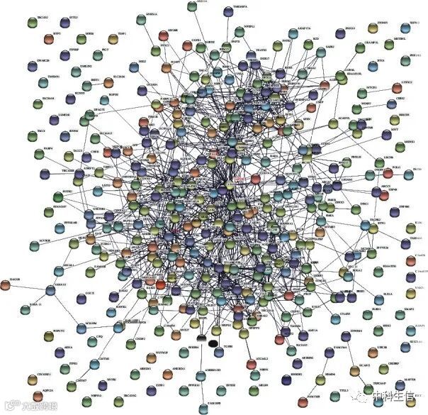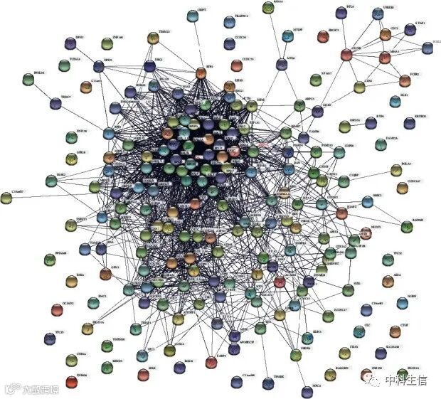在上调DEG构建的PPI网络中展示了379个节点(蛋白质)和1149个 边(交互)(图4)。在下调DEG构建的PPI网络中观察到202个节点(蛋白质)和1963个边(交互)(图5)。在上调基因中,GAPDH和RHOA被认为是hub蛋白和关键基因。在下调基因中,RPS29和RPS27A是最重要的。这表明它们可能在AD中发挥重要作用。