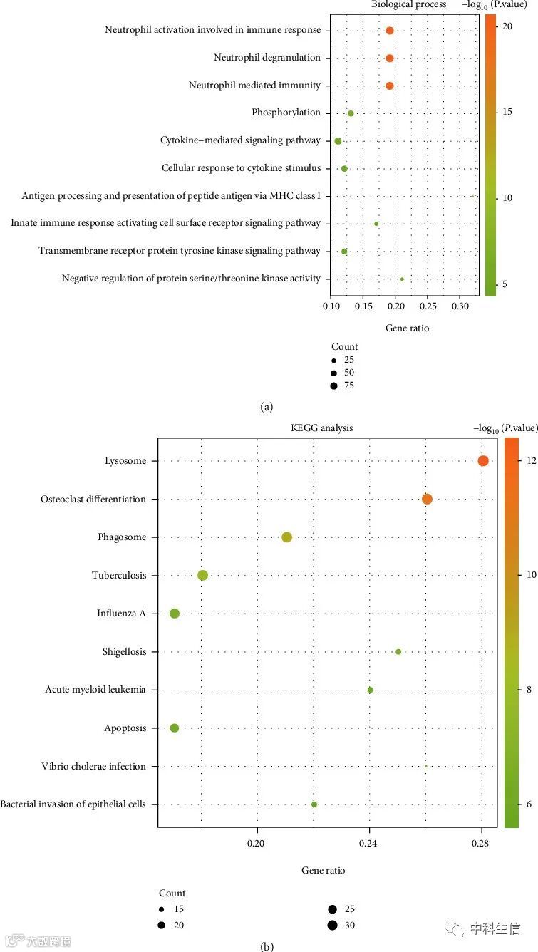功能富集分析表明,上调DEG与激活的中性粒细胞参与的免疫反应、中性粒细胞的脱粒和中性粒细胞介导的免疫显着相关(图2a)。溶酶体、破骨细胞分化和吞噬体是这些上调基因的重要通路(图2b)。下调DEG主要与肽生物合成过程、翻译、核糖体和靶向膜的SRP依赖性共翻译蛋白有关(图3a)。核糖体、氧化磷酸化和非酒精性脂肪肝病 (NAFLD) 是下调DEG的显着富集通路(图3b)。