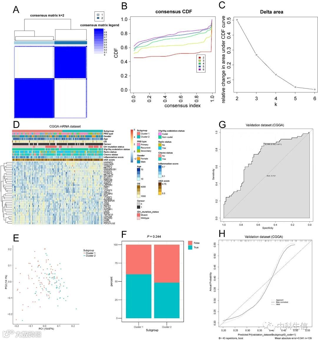 接下来构建并验证了一个预测列线图模型来区分这两个集群,LASSO 算法识别了 6个基因构成的模型。列线图在TCGA、CGGA等数据进行绘制。