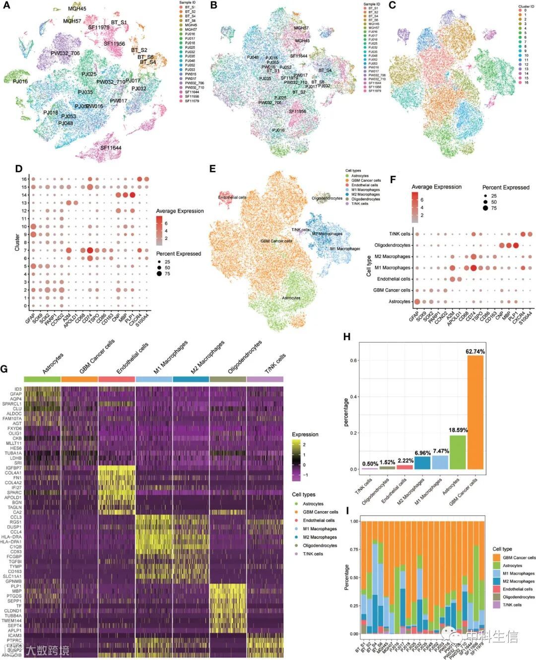 从 22 个 GBM 单细胞样本中经过质控保留了 47 978 个单细胞。接着进行批次整合,通过无监督分类,细胞被成功分类为 17 个簇(图 2C)。种细胞类型:GBM 癌细胞、M1巨噬细胞、M2巨噬细胞、T细胞或自然杀伤(NK)细胞、内皮细胞、星形胶质细胞 、少突胶质细胞(图 2D-F、H)。