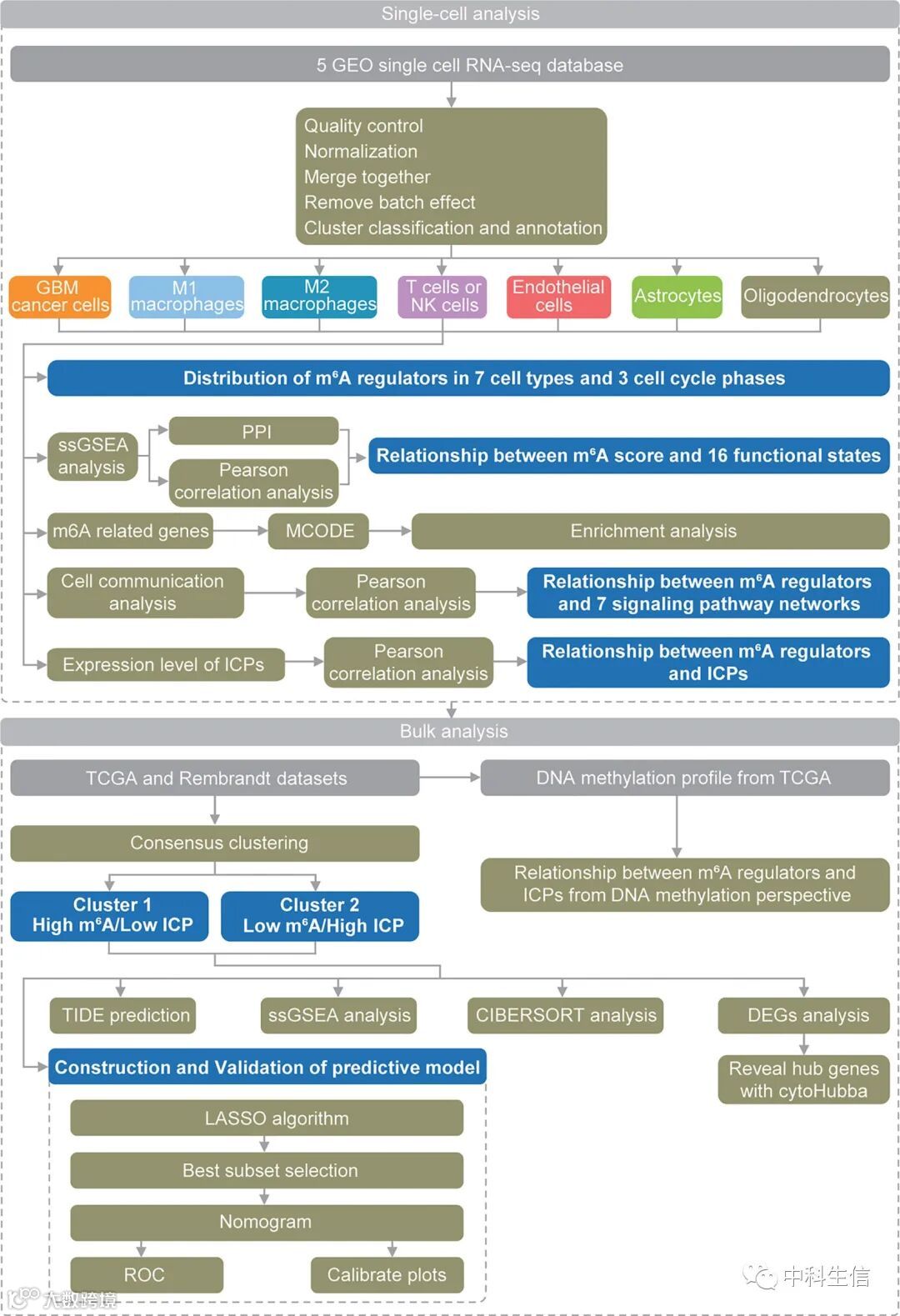 早上好,今天小编分享一篇2022年4月26日发表在Frontiers in Immunology (IF:7.561)上的一篇m6A 联合单细胞的文章《Roles of the m6A Modification of RNA in the Glioblastoma Microenvironment as Revealed by Single-Cell Analyses》,作者在单细胞水平上分析多形性胶质母细胞瘤 (GBM)中m6A 修饰确定其功能状态、细胞通讯和免疫检查点 (ICPs) 的关系,并结合Bulk数据进行进一步分析。