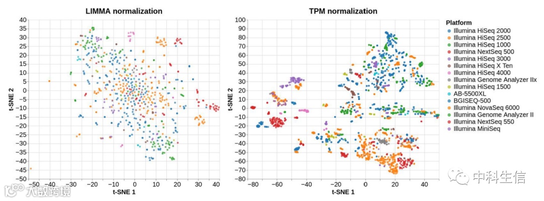 图4. 相同 RNA-seq 样本的 t-SNE 图使用 LIMMA(左侧)和 TPM(右侧)标准化。