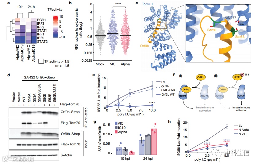 为了进一步了解宿主对Alpha反应的差异,我们使用RNA-seq数据集,通过将靶基因映射到相应的转录调控因子来估计转录因子的活性。我们从无偏倚RNA-seq通路富集分析中提取了富集度最高的前5个术语中显著调节的转录因子(图2b)。这表明IRF和STAT转录因子家族被Alpha激活的程度明显低于第一波病毒(图4a)。一致地,单细胞免疫荧光检测IRF3核易位显示,与VIC感染相比,Alpha感染后IRF3的激活减少(图4b)。STAT1、STAT2和IRF9位于I型IFN受体的下游,Alpha的强效抑制与Orf6水平的升高一致,已知Orf6抑制STAT1和IRF3的核易位。