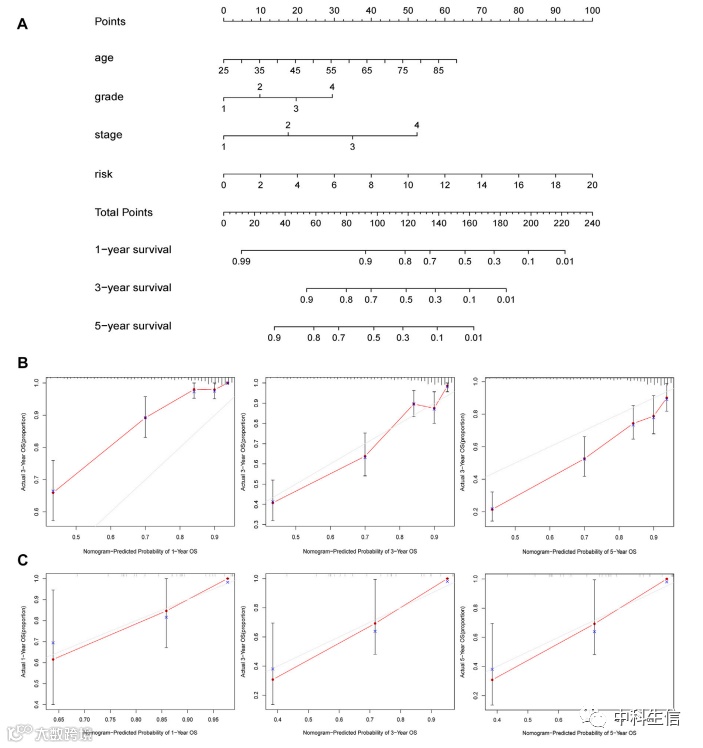 为了评估 KIRC 预后的临床特征和缺氧免疫相关的预后模型,我们构建了列线图,还描绘了 1、3 和 5 年的相应校准图,发现列线图的性能非常好,尤其是在预测 3 年和 5 年 OS 方面。