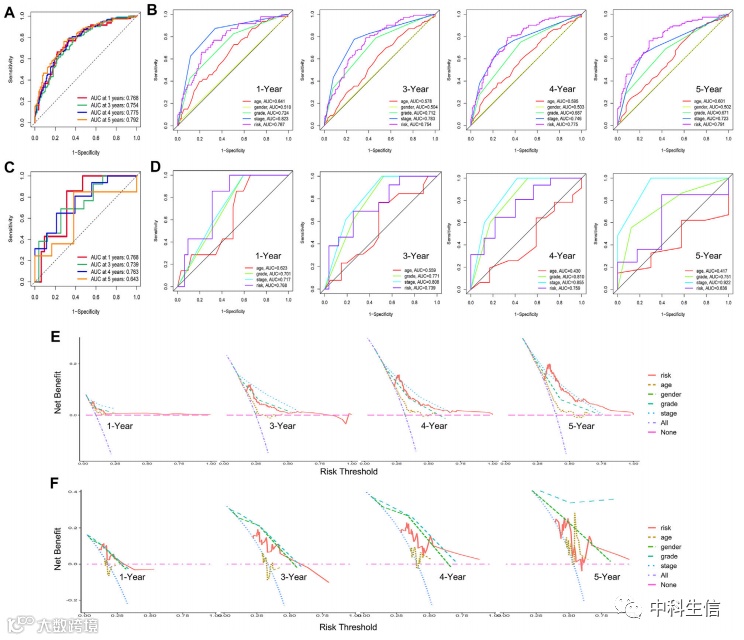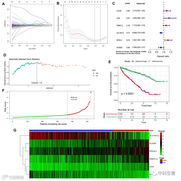 通过利用单变量 Cox 回归、多变量 Cox 回归和 LASSO 回归,我们从缺氧免疫相关基因集中选择了总共 6 个特征基因(PLAUR、UCN、PABPC1L、SLC16A12、NFE2L3 和 KCNAB1)来构建预后模型,然后,我们进行了一系列分析,以验证上述构建的预测模型的有效性和敏感性。
