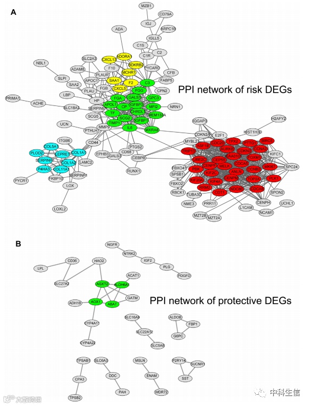 通过使用 STRING 数据库和 Cytoscape 软件,分别为缺氧免疫相关风险 DEG 和保护性 DEG 构建了两个 PPI 网络。还利用 Cytoscape 软件找到这两个网络的密集连接区域,并用不同的颜色标记它们。
