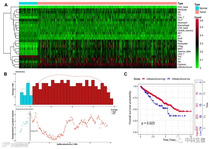 ImmuCellAl计算了所有TCGA样本的所有24个免疫细胞的浸润比例,ImmuCellAl 还为所有样本提供了一个浸润评分术语,范围从 0.351 到 0.9,代表了患者所有免疫细胞浸润比例的总体水平。基于浸润评分,将患者分为免疫高和免疫低组。免疫高组患者的生存结果明显优于免疫低组。