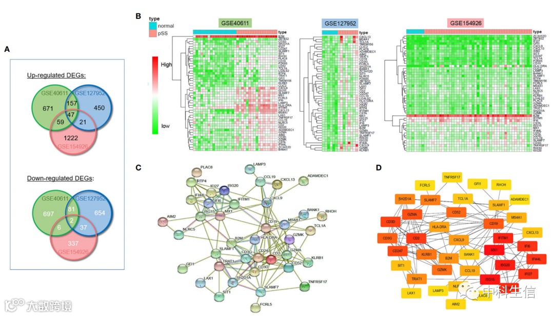 图2.GSE40611、GSE127952和GSE154926数据集中的pSS和正常样本中的差异表达基因(DEGs)。