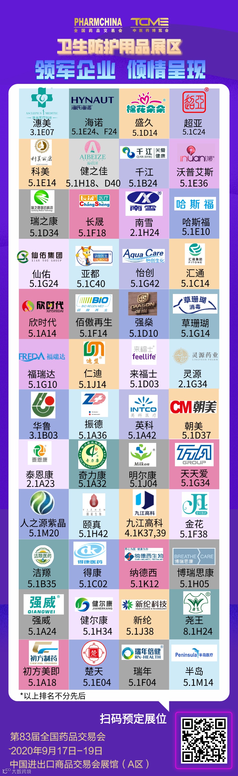 由国药励展主办的第83届全国药品交易会(PHARMCHINA)、中医药博览会(2020TCME)、中国家庭医疗用品展览会(2020LifeCare)、中国国际健康营养博览会(2020NHNE)、中国国际天然食品和饮料博览会(2020NFBE)/2020中国健康营养原辅料/包装/设备展(NHi)将于2020年9月17-19日,于中国进出口商品交易会展馆A区(广州)举办,2020年度仅此一次,其行业参与热度空前,整体规模、展商数量和观众数量仍将是行业首屈一指。