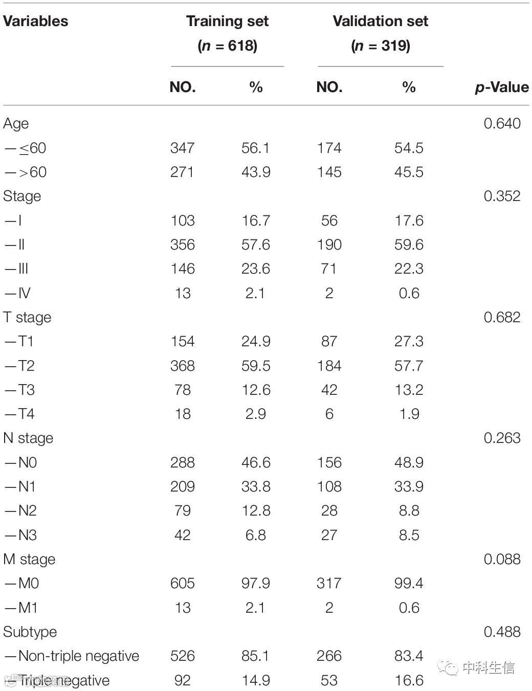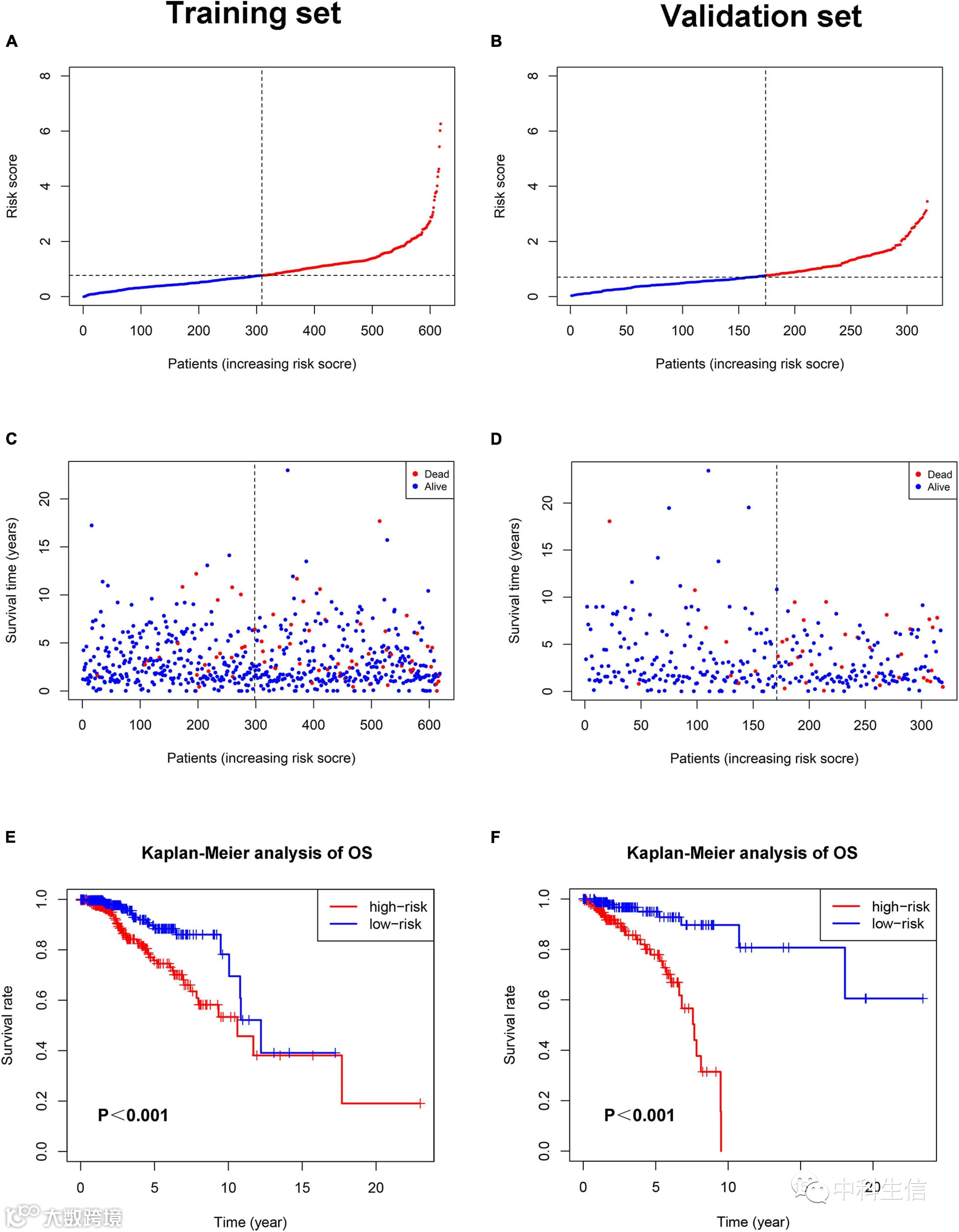 训练集中的每位患者都根据上述公式获得风险评分。然后,根据风险评分的中位值将患者分为高风险组(n = 309)和低风险组(n =309)。风险评分与BC患者的T分期和免疫组织化学(IHC)亚型显著相关(表 2)。如图3C所示,在训练组中具有高风险评分的BC患者往往更早死亡。Kaplan-Meier分析的结果表明,高风险组的BRCA患者的OS较短(图E)。我们还分析了这两组患者的疾病特异性生存期(DSS)和无病生存期(DFS),结果显示,高危组BC患者的DSS和DFS比低危组患者短(图A,C)。低风险组的5年DFS率高于高风险组(91.5% vs 83.8%)。低风险组的5年DSS率也较高(95.2%对84.1%)。
