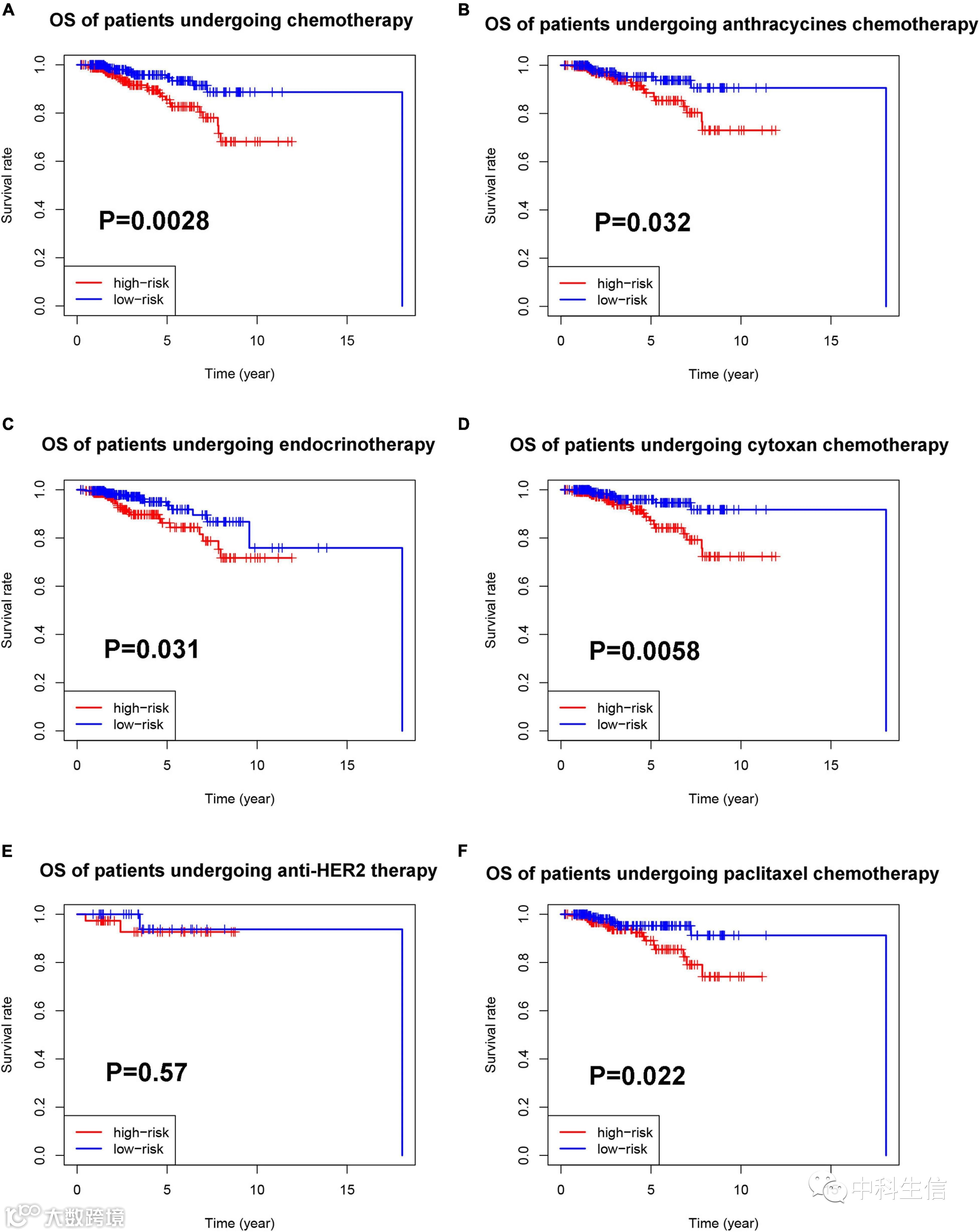然后,作者探索了接受不同治疗方案的BC患者中与焦变相关的lncRNA特征的预后价值。在接受化疗的BC患者中,基于脓毒相关的lncRNA特征的高危组患者的预后明显较差(图A)。在接受内分泌治疗的BC患者中,高危组患者的预后也较差(图C)。还分析了接受抗HER2治疗的患者中与焦沉着相关的lncRNA特征的预后价值,但低危和高危患者的预后差异无显着差异(图E)。为了进一步探讨肝炎相关性lncRNA特征在不同化疗方案患者中的价值,分别分析了蒽环类、环磷酰胺或紫杉醇治疗患者的预后。结果显示,在接受蒽环类药物、环磷酰胺或紫杉醇治疗的患者中,高危组患者的预后较差(图B,D,F)。