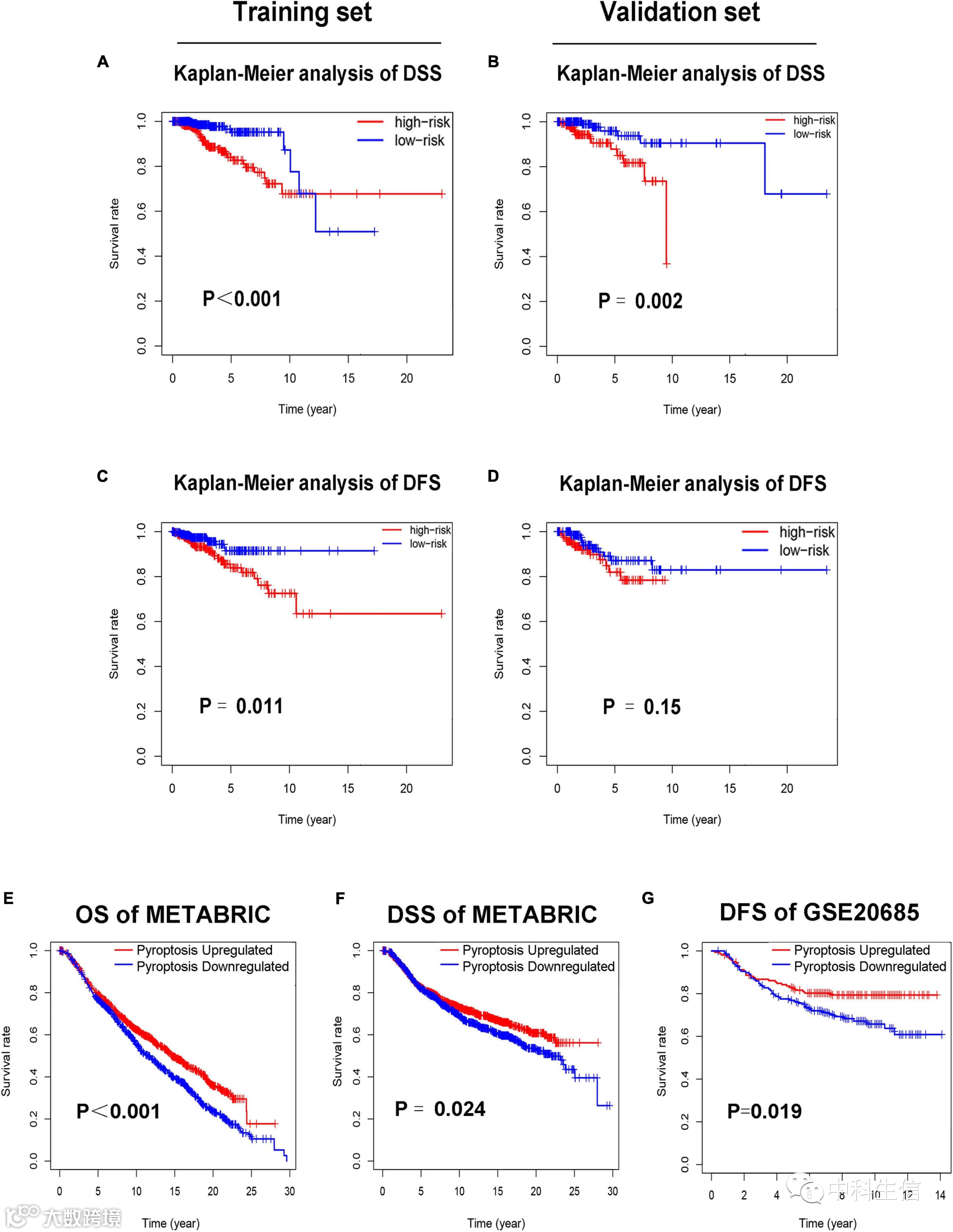 为了进一步证实脓毒症患者与BC患者预后的关系,采用ssGSEA评估了METABRIC和GSE20685数据库BC患者中脓疱病通路的激活水平。METABRIC和GSE20685数据库中的每位患者都获得了基于ssGSEA的焦亡通路评分。根据脓毒症通路评分的中位值,将METABRIC或 GSE20685 数据库中的患者分为上调组和脓毒下调组。然后,在METABRIC数据库中分析了OS和DSS,在GSE20685数据库中分析了DFS。Kaplan-Meier分析的结果表明,焦变上调组的BC患者的OS,DSS和DFS更长(图E-G)。