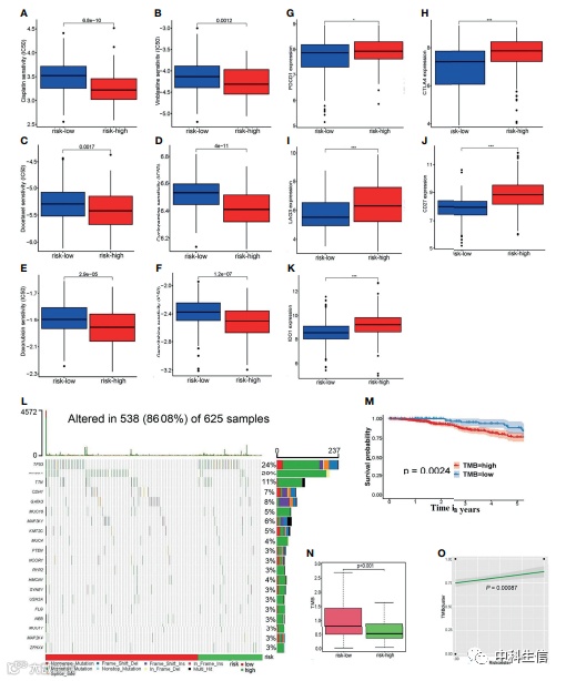 作者分析了风险分数与化疗药物敏感性、TMB的关系。表明风险模型可以作为预测患者对化疗药物的反应性的潜在工具,风险聚类与TMB聚类之间存在正相关。