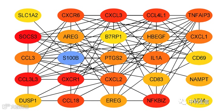 我们将DEGs提交到STRING数据库获取PPI数据,并使用Cytoscape构建PPI网络(图 5),并使用两种算法确定前25个基因为关键基因(图 6和7)。我们将两种算法的关键基因进行交叉,共得到16个关键基因,分别是ADM、CXCR1、CXCR6、CXCL3、CCL3、CCL18、CCL3L3、CCL4L1、CD69、CD83、AREG、EREG、B7RP1、HBEGF、NAMPT和S100B .