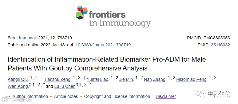哈喽,大家早上好呀,今天小编要和大家分享一篇2022年1月发表在Front Immunol杂志上的文章,题目为《Identification of Inflammation-Related Biomarker Pro-ADM for Male Patients With Gout by Comprehensive Analysis》IF:7.561。