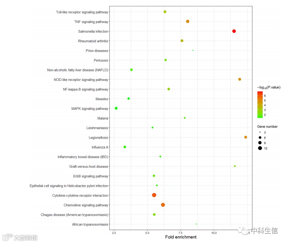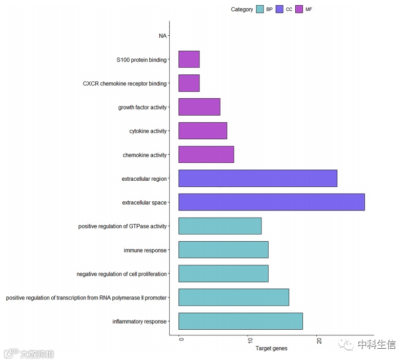 我们使用R语言通过bioconductor平台上的org.Hs.eg.db数据库文件对差异基因进行GO分析,并使用David(https://david.ncifcrf.gov/)在线工具进行KEGG富集分析。对于生物过程、分子功能和细胞组成,共有 12 个 GO(图 3) 和 23 条 KEGG 通路 (图 4) 被识别。