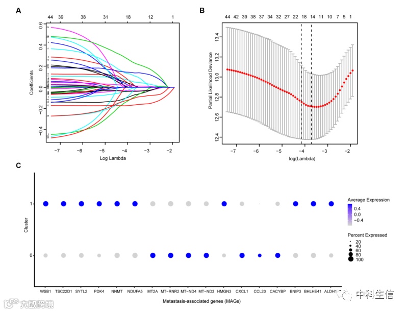 确定预后转移相关基因(图2)。(A,B)我们进行了LASSO方法,并在TCGA训练队列中确定了17个预后基因,其中最佳截止值为-4,最小基因数为17。(C) 同时,我们还通过气泡图展示了两个簇中17个预后基因的显著差异表达。