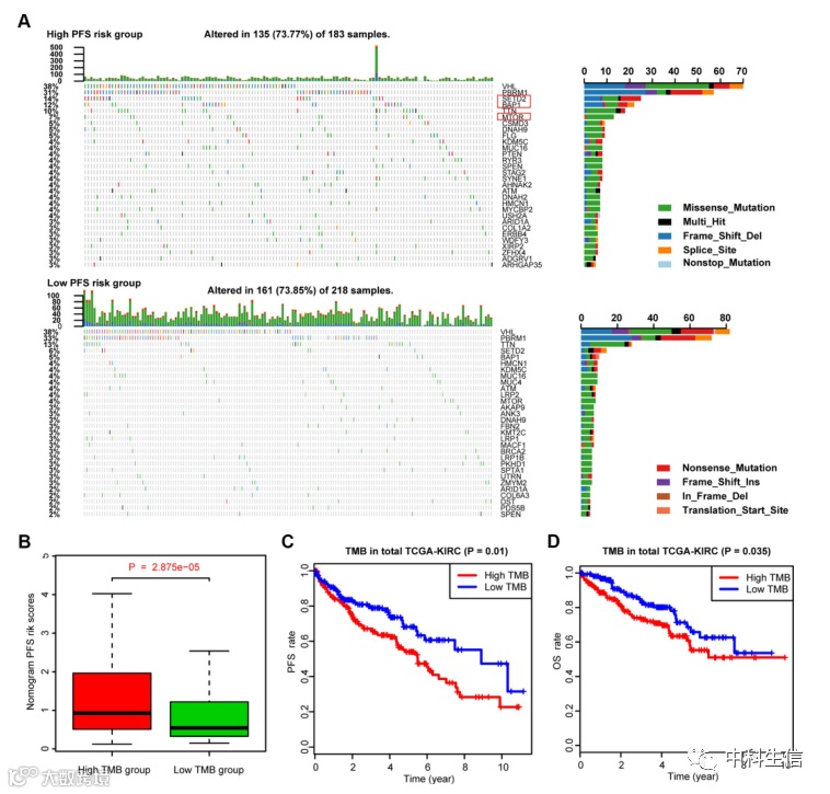 高MAGs列线图水平和低MAGs列线图水平之间的体细胞突变负担差异(图6)。(A) 突变情况反映出高列线图评分组比低列线图评分组更频繁地发生突变事件。此外,卡方检验显示,与低风险组相比,VHL、PBRM1、SETD2和BAP1尤其含有更多的突变体。(B) Wilcoxon秩和检验表明,高TMB组的MAGs列线图风险评分显著高于低TMB组。(C,D)此外,我们发现TMB水平越高,进展事件风险越高,OS预后越差。